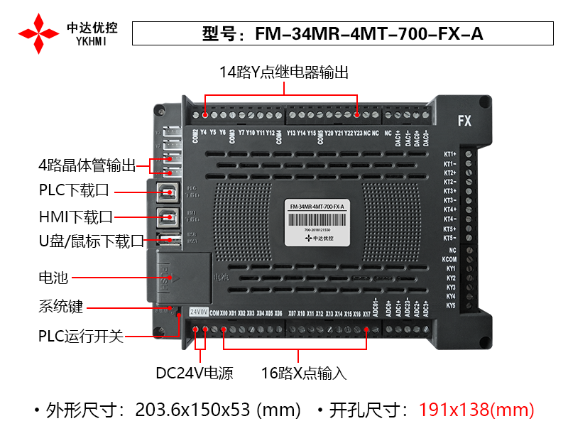 1、16路输入,4路晶体管输出,14路继电器输出; 2、COM1:PLC下载,模拟量通讯;COM2:PLC与触摸屏通讯;