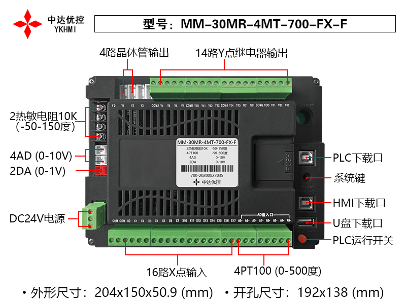1、16路输入,4路晶体管输出,14路继电器输出;2、4路0-10V模拟量输入,2路0-10V模拟量输出;3、2路NTC10K温度输入,4路PT 100温度输入