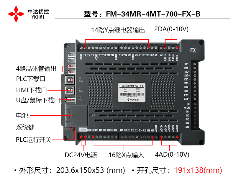 本产品采用24V,75W直流电源供电,含14路继电器输入,4路晶体管输出,16路光耦输出,2路0-10V模拟量输入,2路0-10V模拟量输出。2路10K NTC热敏电阻