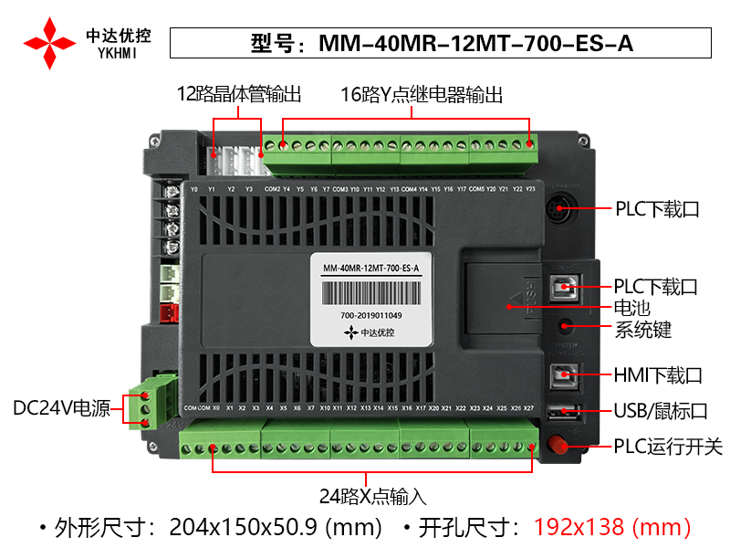 本产品采用24V,75W直流电源供电,含16路继电器输入,12路晶体管输出,24路光耦输出,1个485通讯口