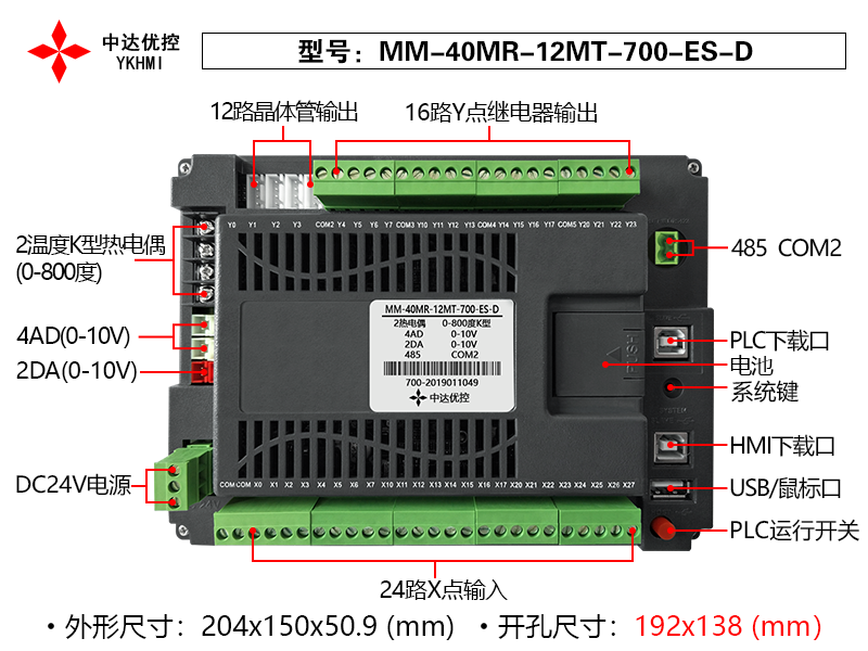 本产品采用24V,75W直流电源供电,含16路继电器输入,12路晶体管输出,24路光耦输出,4路0-10V模拟量输入,2路热电偶输入,2路0-10V模拟量输出。