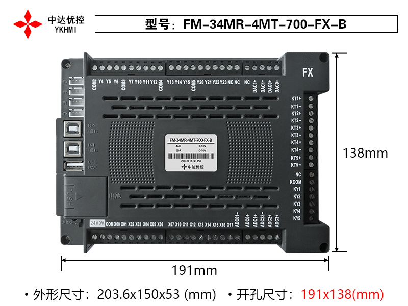 本产品采用24V,75W直流电源供电,含14路继电器输入,4路晶体管输出,16路光耦输出,2路0-10V模拟量输入,2路0-10V模拟量输出。2路10K NTC热敏电阻